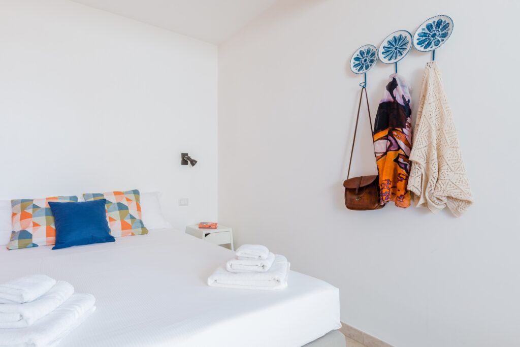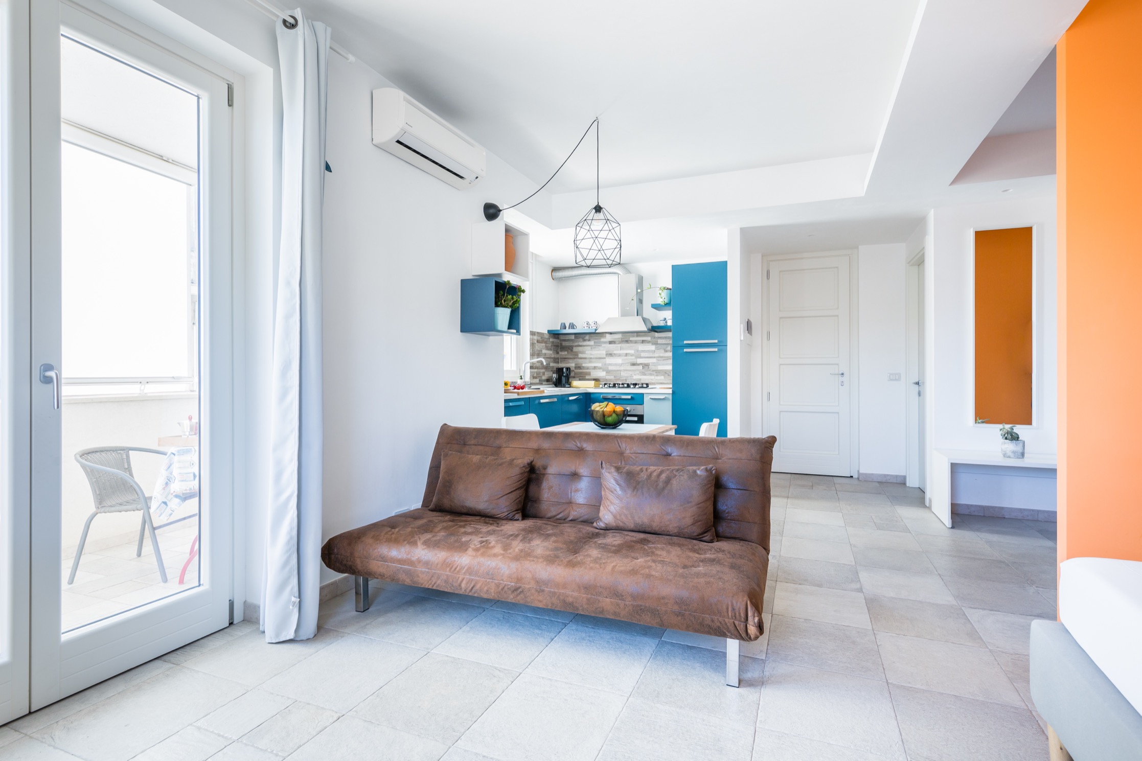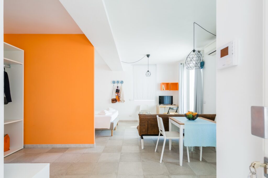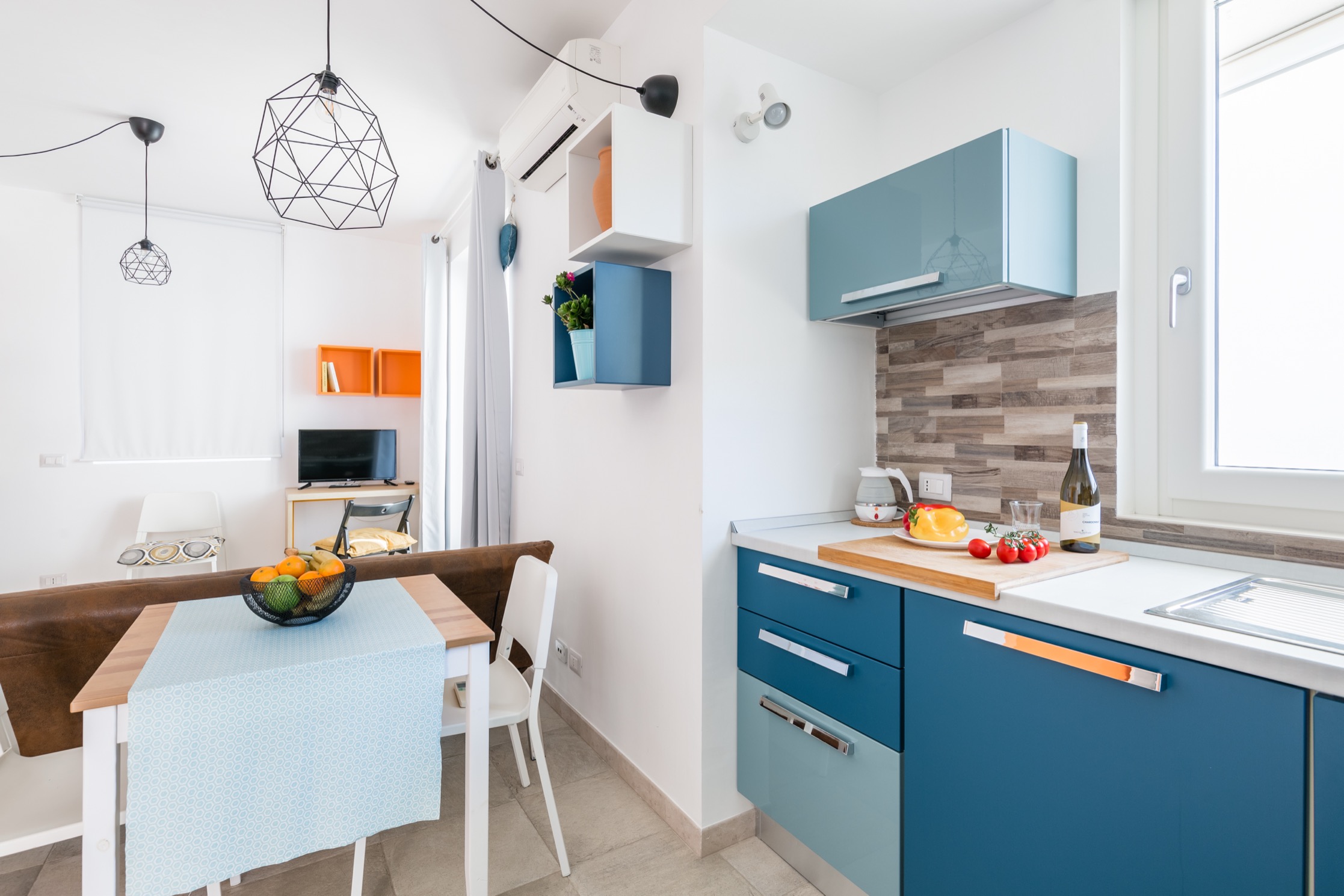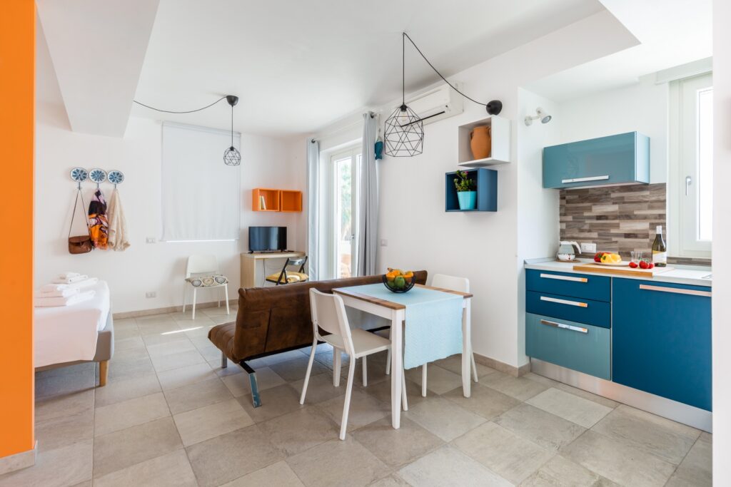 L’appartamento, raggiungibile tramite comode scale, si distingue per uno stile vivace e accogliente: le pareti color arancio donano calore all’ambiente, mentre i mobili in tonalità blu e azzurro creano un piacevole contrasto marino.