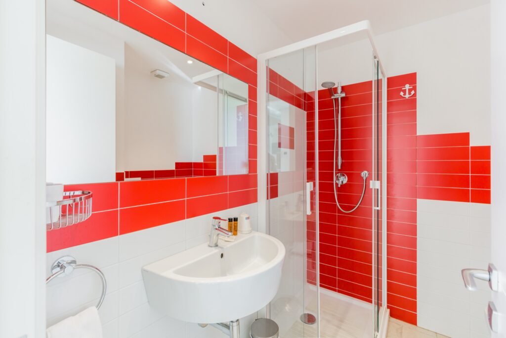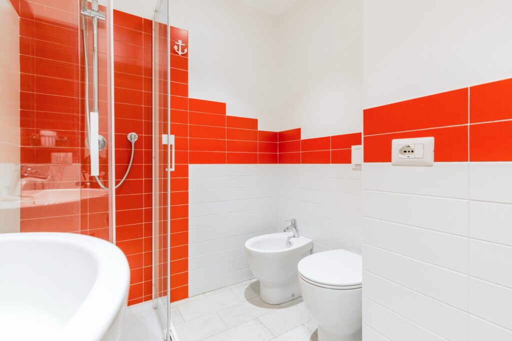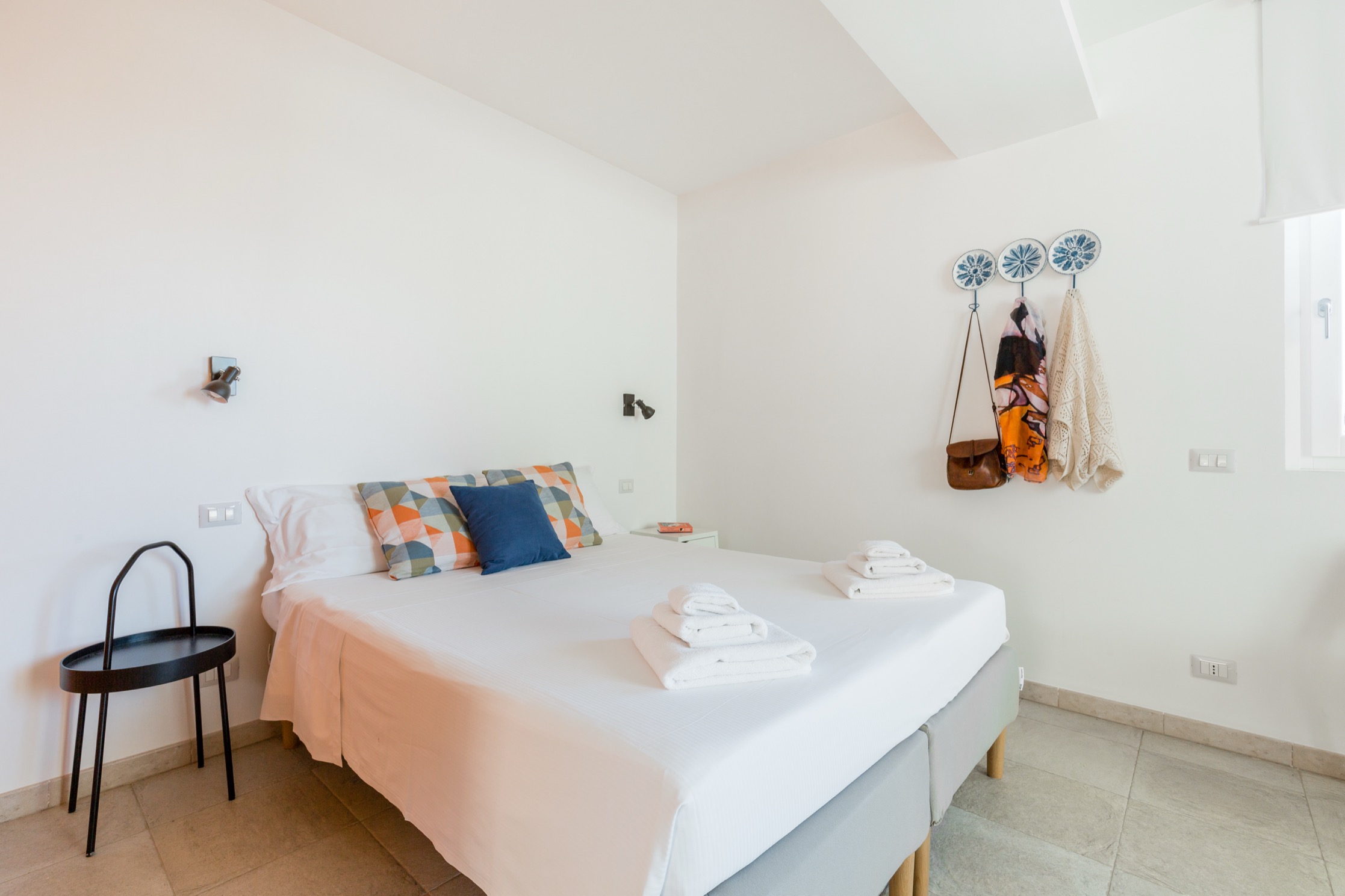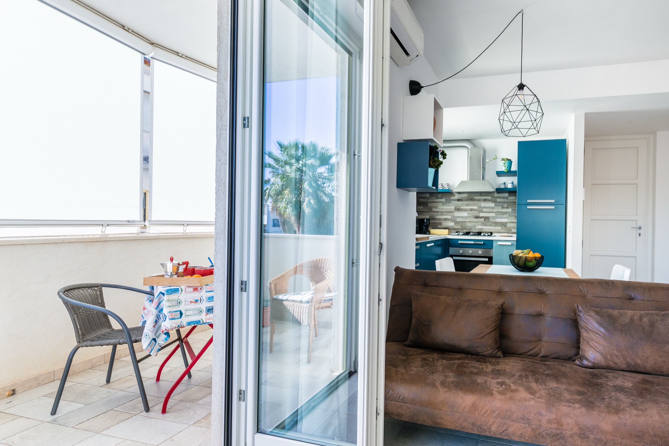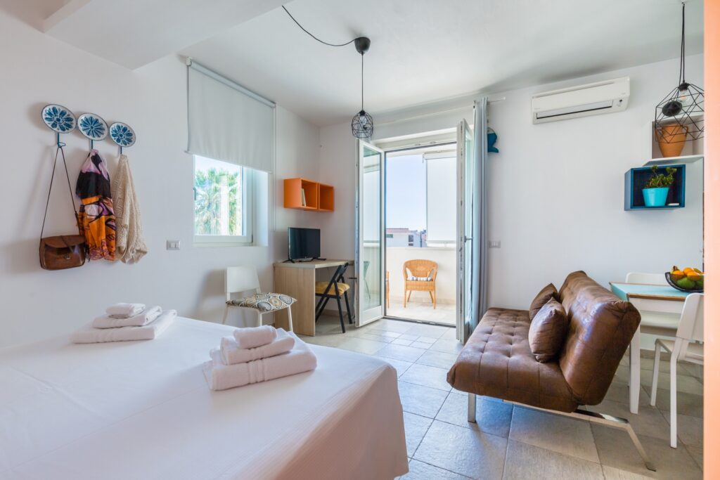 L’appartamento, raggiungibile tramite comode scale, si distingue per uno stile vivace e accogliente: le pareti color arancio donano calore all’ambiente, mentre i mobili in tonalità blu e azzurro creano un piacevole contrasto marino.
